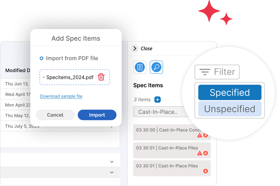 Effortlessly import your project’s spec items directly from PDF or CSV files. Additionally, add or remove individual spec items manually as needed, giving you complete control over the project’s specifications and ensuring better accuracy throughout the project’s lifecycle.